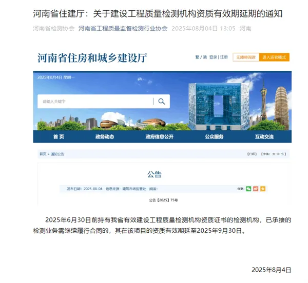 河南省住建厅:关于建设工程质量检测机构资质有效期延期的通知